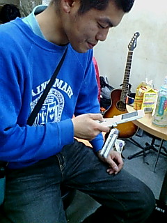 今回は、塙町、男根会長バズドラ宅近くの河原で昼間からバーベキュー!! 遠くは小山、宇都宮からの参加者もいて、盛大だったなぁ。 総勢20人はいたのかな? 野郎だらけのバーベキュー。 川に落ちたー! 記憶もなくしたー! 鍵もなくしたー! バッテリーあがったー! バイク乗ったー! ブランコ乗ったー! ギター弾いたー! カレーが辛れー! ベトナムー! 焼肉のあとのステーキー! はじめてのピータンー! ↑当てはまるみなさん、おつかれ様でした! またやろうぜ!! 野郎が肉喰う写真ではむさくるしいので、蟹ちゃん志望のこの人で。 さて、みんなも帰って俺と北ちゃん、しんじは会長宅にお泊り保育。 なんで俺だけマクラがバンビの可愛いやつなの!? イビキにうなされながらも朝8:30には起床。 10時には近所の食堂に。 「じゃ、とりあえず生と。。。」 まだ飲むのかい。この人ら。 バカだ。 朝から大宴会して、やっとこさっき帰宅。 どれ、天気がいいから、これからいつもの場所で路上してくっかな。 夜はt&tでクノック企画。 明日はヨウヨウライブ。 まさにゴールデン!!! PR 2007.05.04 Fri 11:11:11 ヒッパーゴールデンウィーク初日。