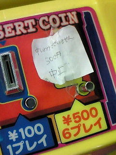 テーテースタッフの帰りに鑑定団のゲームでWiiを当てるんだよ。 友達と一緒にいて、俺は500円を機械に入れる。 1回で当たったので、残りは友達にあげる。みたいな夢。 偶然にもその夜はテーテースタッフ。 帰りに友達を連れて鑑定団に。 まさに夢と同じ環境! Wiiか!? Wii当たるのか!? 500円玉を握りしめ、いざゲーム機の前へ。 Wiiの置いてある場所も夢と同じだ。 よし、やろう!と500円投入!! が! 問題発生。 ま、人生こんなもんだ。 この後、無駄に1000円分の100円玉をあっと言う間に機械に飲み込ませ、ゲームオーバーでございました。 あぁ。あと少しだったのにな。。。 んな事より、Wii欲しくないけどね。 2008.05.03 Sat 10:32:18 突入 |